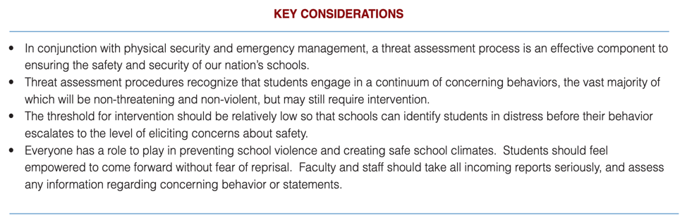 In July 2018, the National Threat Assessment Center for the U.S. Secret Service released “Enhancing School Safety Using a Threat Assessment Model: An Operational Guide for Preventing Targeted School Violence.” This comprehensive document provides school administrators with a literal roadmap for developing, implementing, and/or improving their Threat Assessment Programs. The programs described in this guide have been responsible for hundreds – if not thousands – of proactive interventions, effectively preventing potential incidents of targeted school violence.